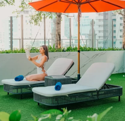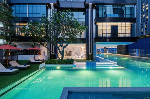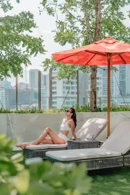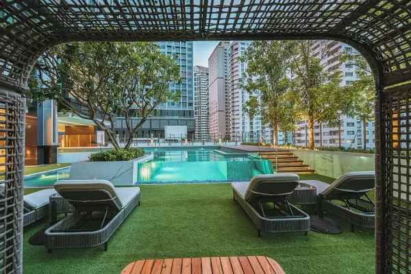 พื้นที่ผ่อนคลายกลางแจ้ง: นอกเหนือจากสระว่ายน้ำ พบกับพื้นที่กลางแจ้งที่กว้างขวางและเงียบสงบที่ออกแบบมาเพื่อการพักผ่อนท่ามกลางเมืองที่พลุกพล่าน